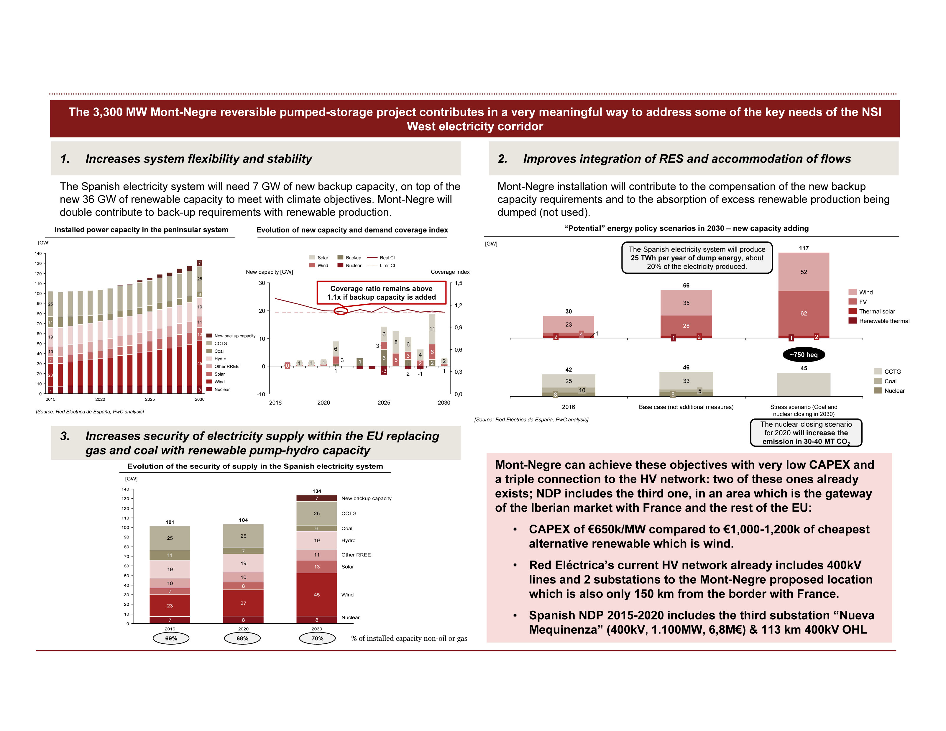 As explained in section III – “RATIONALE», the 3,300 MW ‘MONT-NEGRE’ REVERSIBLE PUMPED STORAGE HYDROELECTRIC PLANT ON THE SEGRE RIVER (TOWNSHIP OF MEQUINENZA-ZARAGOZA), as a pure pumped storage plant, is the only proven technology that is able to guarantee security of supply and system sustainability. In addition, the storage capability of the plant, also contributes to provide a quasi-immediate response to electricity demand fluctuation thus increasing the technical resilience of the grid and the electric system in which the plant operates.